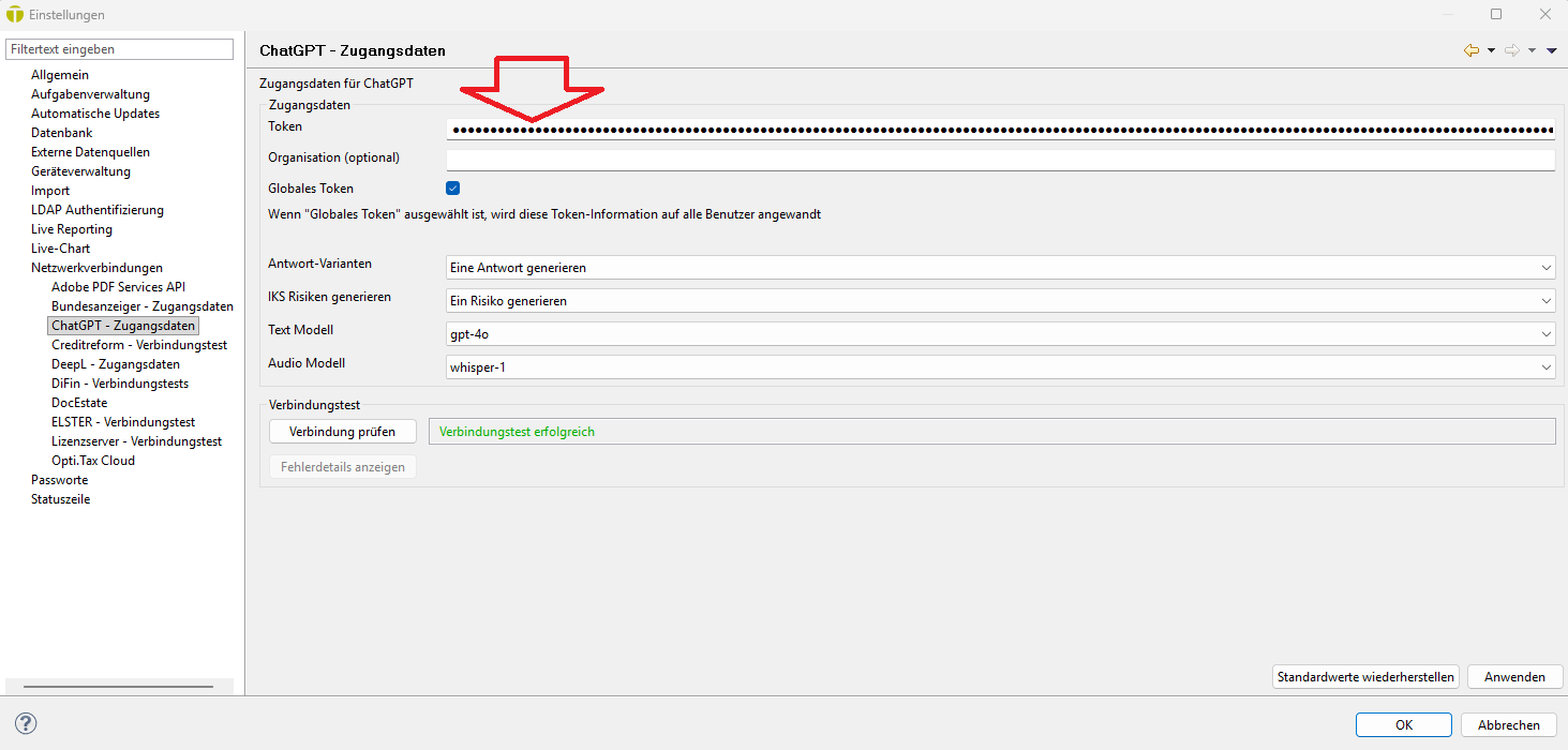 - Fügen Sie den zuvor kopierten API-Key in das Feld „ChatGPT-Token“ ein.